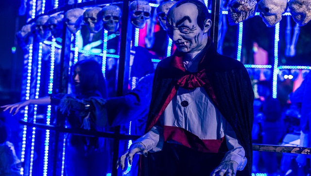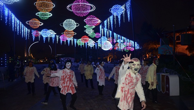 除了密布全园的恐怖装饰,五彩缤纷的灯光布置也是今年万圣节的一大亮点!万圣节不再只是鬼怪横行,整个园区被施加光影魔法。由LED环保节能光源组成的浩瀚宇宙、神秘海底世界、童趣地面投影等与七大鬼屋、六大捣鬼地带相呼应,迷幻的灯光与魅惑的鬼影交织在一起,让万圣之夜充满提心吊胆的未知和遐想无限的梦幻!