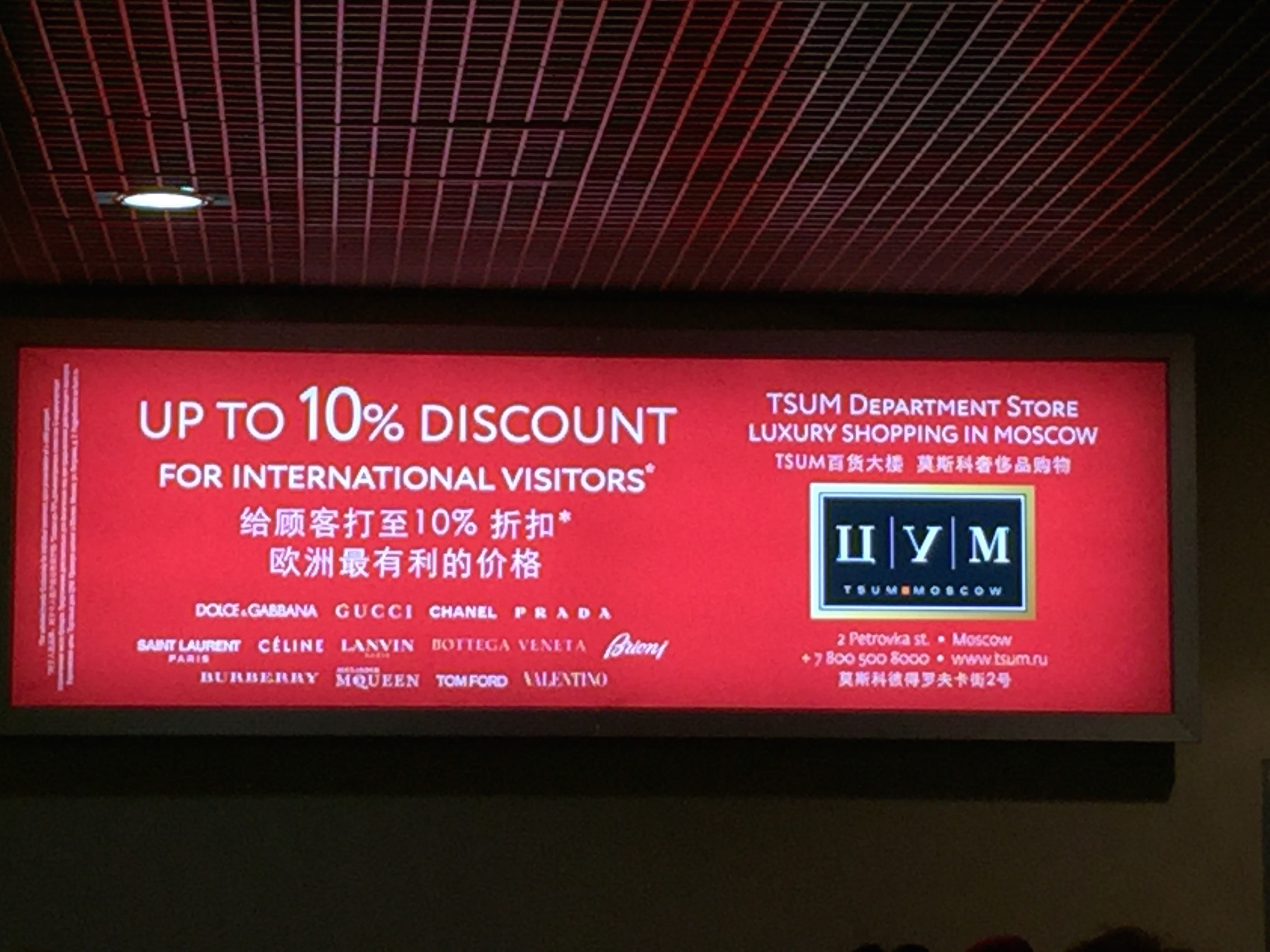 然后在机场和市区购物点,真能看到好多中文的购物标示,这在以前是无法想象的,钱的诱惑力还是大,在俄罗斯比较值得购买的是貂皮,还有特产紫晶项链,卢布贬值比国内至少便宜三分之一。