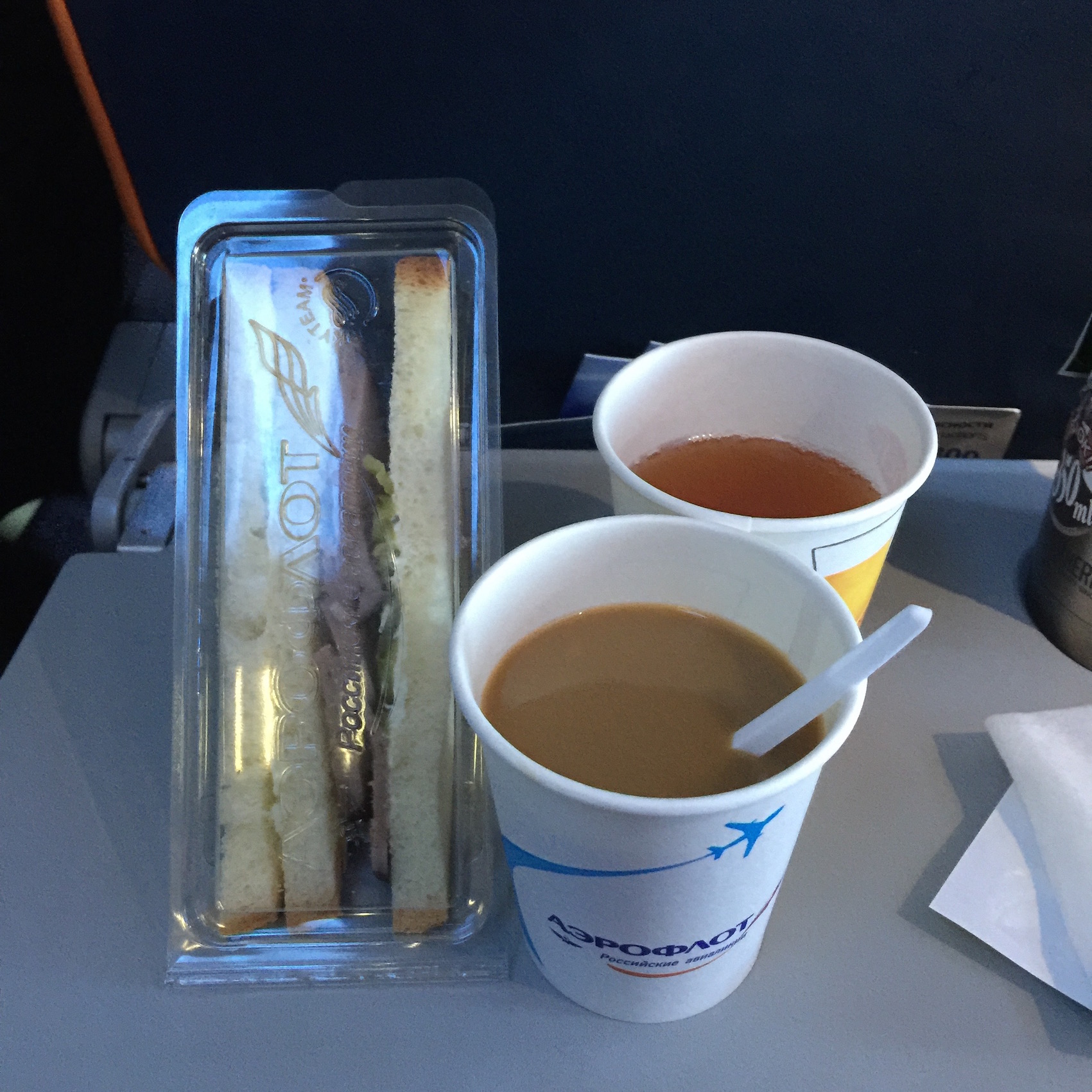 如果是到莫斯科转机话,不要抱任何逛机场的希望,那个机场是见过最小的机场了。当然俄航的餐食都是相当简单,基本都是一杯饮料咖啡再加一个三明治打发完毕,不过三明治味道还是很心水。