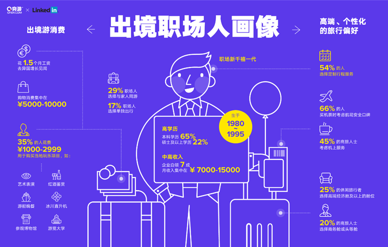 中国巴蜀在线四川成都11月15日讯 近日,国内最大出境游一站式平台穷游网与全球最大的职场社交平台领英(LinkedIn)联合发布《2016中国职场人出境游行为报告》。报告面向19个一线及新一线[1]城市的近10000名“上班族”、自由职业者及创业者等开展了问卷调研,分析了在出境游大热的新形势下,职场人出境游的心态诉求以及行为习惯的变化。数据表明,职场人对高端个性化旅行体验的需求日益强烈。