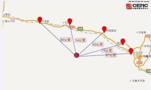 震中距玛纳斯县54公里、距呼图壁县60公里、距昌吉市76公里、距沙湾县80公里、距头屯河区87公里,距地级市石河子市57公里,距省会城市乌鲁木齐市103公里。