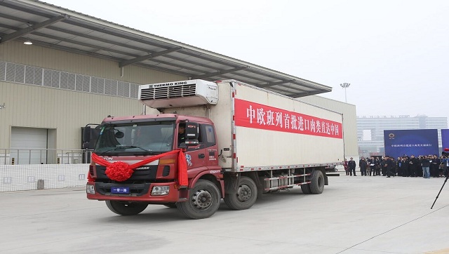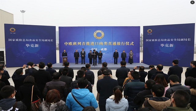 中国巴蜀在线四川成都12月12日讯 11日上午,成都青白江国际铁路港口岸内,国内首批通过蓉欧快铁中欧班列运输进口的欧洲猪肉直通放行。据了解,这标志着我国通过铁路运输方式进口欧洲肉类产品的通道正式打通,同时改写了内陆地区只能通过沿海港口进口肉类的历史,实现了进口肉类由内陆城市向全国各地分拨的新模式。