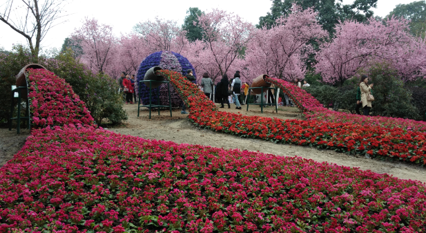 据了解,花展有5大看点:春花小乔木、虞美人花海、节点花境、艺术小品、科普活动。植物园园艺专家介绍,每年的春花展,梅花、玉兰、樱花、海棠、梨花等传统春花小乔都是游客朋友的必看之景,今年的樱花中,除了日本晚樱,又增添了新成员,如果近日赶来,正可见识牡丹樱及广州樱的美丽。深红色的牡丹樱花开已近尾声,而粉红的单瓣广州樱目前正怒放枝头,与一组树篼花境构成了一幅灵动的自然山水画,相信大家一定会喜欢。另外,樱花中的新成员还有中国红、寒绯樱、福建山樱花等,数量虽然不多,但花色花型也显独特,开花较早,12月便能初见其美丽风姿。