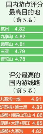 报告发布的“国内游点评分最高15大目的地”依次是:杭州、九寨沟、峨眉山(微博)、三亚、普陀山、桂林、丽江、乌镇、稻城、昆明、上海、张家界、成都、长沙、西安。其中,杭州以4.82分位居国内第1名。