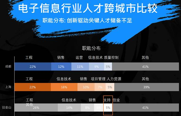 从电子信息行业的职能分布对比,成都在销售、运营方面的人才占比相对较高,而在信息技术方面的人才低于上海和旧金山。可见,虽然成都人才数量上已经形成优势,但在创新领域相关的人才结构仍有优化升级的空间。