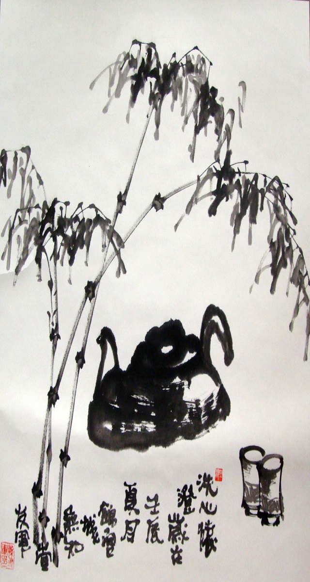 墨竹有无止境的探索,更可容纳书画高深水平的发挥。然而,它又具有简而易为,适于不同水平人作画的特点,在画竹作品中,文人墨戏,逸笔草草者不乏其例;儿童涂鸦,初学练笔者也时有所见。画家可用其作高水平的艺术创作,初学者也可作为绘画启蒙的入门。画家爱画,书家也画,初学乍练者也能画,这样墨竹作画的范围扩大了。众人拾材火焰高,百花怒放之势,也就自然形成。