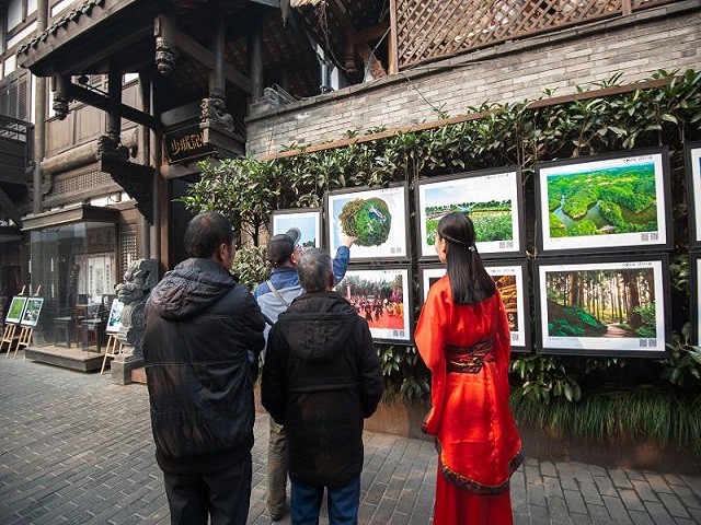 本次摄影图片展以“丝路山水,醉美邛崃”为主题,南方丝绸之路是以成都为起点的重要国际经济文化交流通道,巴蜀四大古城之一的邛崃便是南丝路西出成都第一站。本次展出涵盖临邛古城、文君井、邛窑遗址、大同石刻等人文古迹,天台山、南宝山等风景名胜,平乐、大同、夹关、火井等特色古镇,中国酒村、天府红谷、黑虎农庄等乡村旅游景点。邛崃四季美景、人文历史、特色商品在一幅幅精美作品中一览无余。与此同时,为进一步凸显“文君故里”城市形象,图片展的解说员均以汉代才女卓文君的古装扮相示人,吸引了过往游客纷纷驻足围观合影。来自西安的张先生表示,这种创新的形式不仅能让游客听到更多的“画”外音,从而勾起对邛崃、对南方丝绸之路强烈的向往,充满乐趣的互动也给人留下了非常深刻的印象。