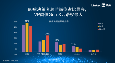 值得关注的是,在商业决策者的公司规模分布上,相较于X一代的“大公司情结” (公司规模超过10,000员工),90后商业决策者更加趋向汇聚在中小企业(200人以下)。与此相关的是,在商业决策者担任的职位方面,90后在CXO和企业主上占比超过前代, 80后在总监职位上占比最高,而X一代在VP岗位则占据了最大的话语权。