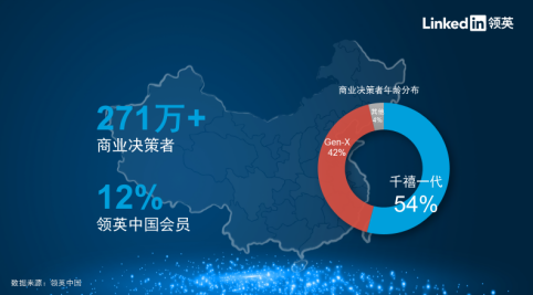 “千禧一代”泛指于1980至2000年出生的人群。今天,千禧一代已成为越来越多的国家人口的中流砥柱,其思维和行为模式正在对全球的政治、经济、文化产生不容忽视的影响。为了探究代际变迁对中国商业的影响,领英基于平台海量的真实数据,专门发布了《中国千禧一代商业决策者洞察》,希望从职业属性、人群分布、职场行为模式和社交影响力等多个维度深入研究千禧一代商业决策者。数据显示,领英汇聚了超过5.46亿全球职场人,包括近4000万商业决策者(总监级别及以上),其中千禧一代的决策者占比已经达到28%,无疑已经成为崛起中的重要力量。领英中国则拥有超过270万商业决策者用户,其中千禧一代已超过商业决策者总数的50%。