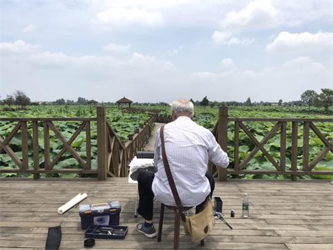 中国巴蜀在线成都邛崃6月29日讯 网红歌曲《远村》火了邛崃市高埂镇千亩荷塘,今日,笔者在该镇光明村文君荷塘游步道上看到,许多游客慕名来此写生作画。其中,一名白发老人引起了记者的关注,他是邛崃当地的一名书画家,专注荷花主题创作已有数十年。“这里的荷花与其它地方不同,连绵不绝,无边无际,非常壮观。”