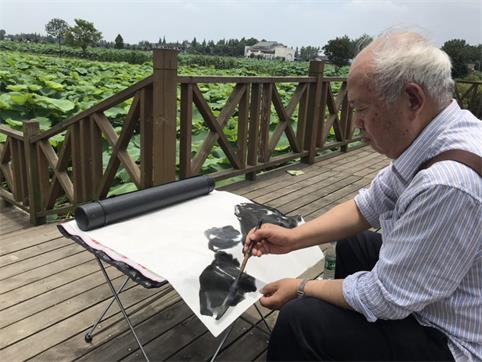 黄世明老人笔下多是写意大气的泼墨荷花,饱蘸水墨,荷花亭亭玉立,素雅多姿;荷叶外实中虚,笔触细腻。多年来,老人的绘画作品多次受邀参展,举办过两次个人绘画展,出版过两本书画集,都取得了良好的社会反响。随着年龄和阅历的增长,老人心中的荷花已是高洁品格的化身,“荷花是君子之花,‘出淤泥而不染,濯清涟而不妖’。人也当如此,高洁处事,清白做人。”
