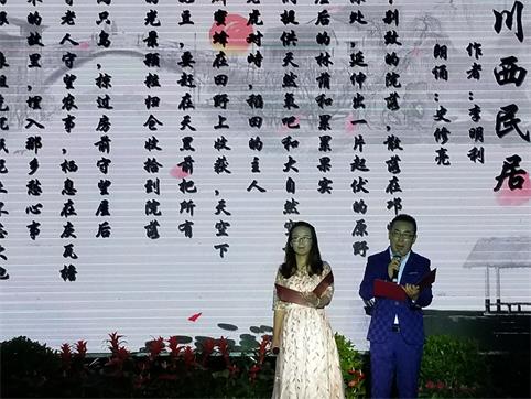 8时许,10名儿童以丰收为主题的古诗串烧开场,4名青年朗读者丰收新诗串烧,带着丰收的喜悦与泥土的芳香,拉开了晚会序曲。开场第一篇是由当代诗人李明利创作、邛崃市青年教师史修亮朗诵的《川西民居》,诗歌以富有特色的川西民居进行空间的布局转移,穿插川西劳动人民的生活剪影与丰收喜悦,蓦地笔触一转,带领读者穿过岁月,感受流淌出的浓浓“乡愁心事”与对土地的热爱和眷恋。最后一句读音刚落,现场便爆发出热烈的掌声和不断的叫好声。“我们祖辈都住在川西民居,听着朗读,感觉这就是我的祖辈们生活写照。最后的乡愁和怀念亲人真实说出了我的心里话,我很感动!”现场64岁的邛崃市民刘大爷眼里闪着泪光说。