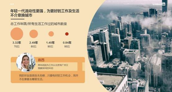 在此前的调研中,领英数据显示90/95后年轻职场人的平均在职时间显著降低,为了追求更好的工作机会他们不介意频繁跳槽。而这样的高流动性同样也体现在城市的变动上。以职场人总工作年限/所有生活工作过的城市数量为衡量依据,领英大数据显示:职场人城市间流动频率,呈现出随年龄的降低而增高的趋势,年轻一代在城市方面的流动性越来越强。70后平均工作3.32年更换一次城市;80后平均2.49年更换一次城市;而这一数字在90后群体中降为1.40年。即便是在刚刚毕业一年有余的95后来说,也有不少已经离开毕业时的城市,选择在另一个城市重新开启职场第二步,这些人的平均时间为0.84年。
