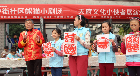 中国巴蜀在线四川成都11月30日讯 由共青团成都市委员会、成都市文化广电新闻出版局主办,成都市青少年宫承办的“天府文化小使者”展演活动11月25日走进了成都商业街社区熊猫邮局铜像小剧场。