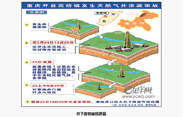 据四川石油管理局办公室介绍,发生渗漏事故的罗家2井位于开县高桥镇小阳村一组,该井和2003年发生“12·23”特大“井喷”事故的罗家16H井处在同一井场。罗家2井于2000年6月钻探完成,井深3404米。川东钻探公司井队于近日对罗家2井进行二次完井作业时,发生井漏事故。至3月24日13时25分,现场施工人员对罗家2井进行了一次大型的压井注水泥施工,但封堵未能成功。25日凌晨,距离井场1公里左右的高桥河面出现浊水柱翻滚,经技术人员检测,其中不含硫化氢气体,含甲烷。25日8时30分,抢险人员对事故井口进行点火泄压。截至25日19时30分记者发稿时,事故井口压力已下降至可控范围。