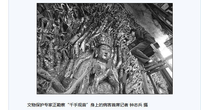 “酸雨对石刻造的腐蚀性是巨大的,它使造像轮廓模糊,呈粉沙状脱落。近十年的腐蚀、剥落,要抵得上无污染环境中上百年的腐蚀和风化。”大足石刻艺术博物馆高级工程师燕学锋在接受记者采访时说。