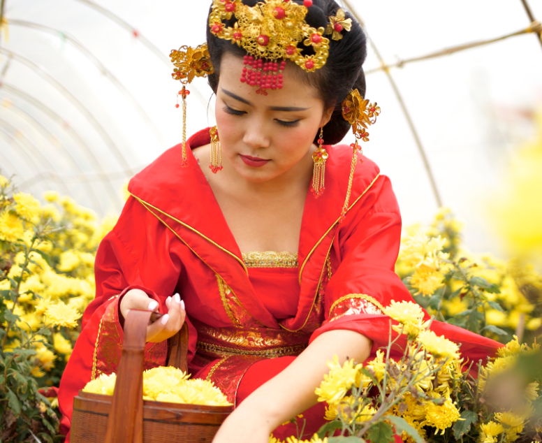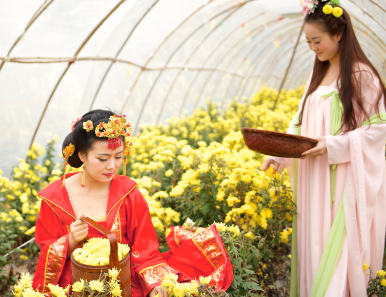 眼前的“唐朝公主”挽着茶篓,笑语绵甜、艳唇云鬟,红颊褶衣间为菊花茶增添了几分惊艳。原来,这群来自成都悠云乡茶舍的“唐朝公主”是专门冲着成都市林木种苗站的金妍皇菊而来,她们借金妍皇菊之美来重现唐朝宫廷采茶那些事儿……这样的意境让人的心也变得神驰起来。