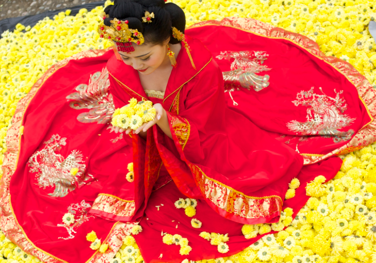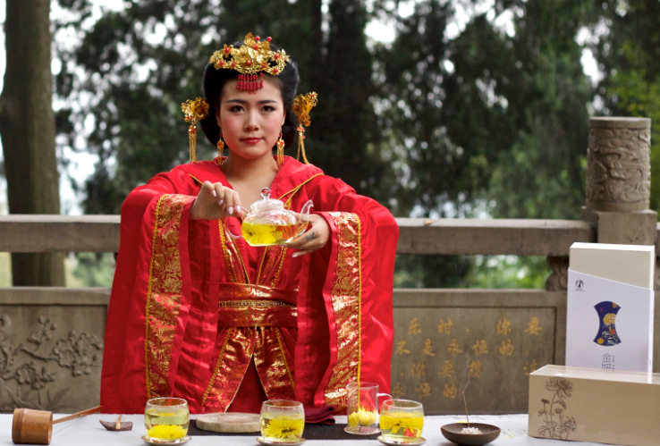 离成都几十公里外的大邑,一片菊花茶海望不到头。时值秋菊绽放,一群头梳半翻髻、螺髻或双螺髻,手中分别持有高足杯、茶篓、包袱等物的“唐朝公主”缓行而至,她们皆着宽袖袒胸短襦,脚着如意云头履,来到田间采摘菊花茶。