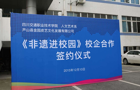 四川省交通职业技术学院党委副书记、院长魏庆曜首先讲话对金园文化公司董事长孙泽慧一行的到来表示热烈欢迎。魏庆曜希望通过校企合作方式,为大学生搭建创业平台,拓宽就业渠道,提高学生实践能力,实现双方互利共赢,学校将有更多的学生、老师来芦山学习、生活、工作。仪式上,现场师生一起听取了民间艺术大师孙泽慧对非遗文化的保护和传承的介绍,了解了公司强劲的综合实力与美好的发展前景,也充分感受了芦山金园皮艺文化发展有限公司“爱我公司,开心工作,为自己、为企业、为社会和谐生活”的核心理念。