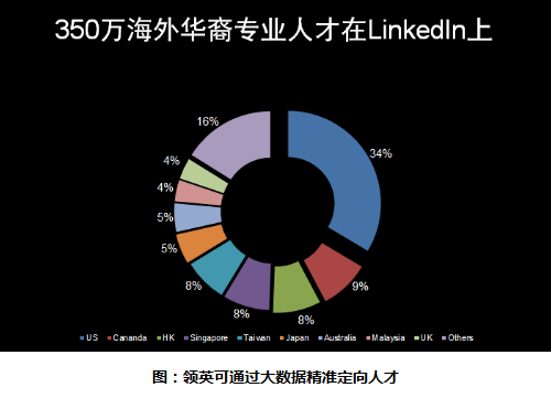 领英在世界范围内拥有超过4亿的用户,能够帮助政府及企业引进高素质海外人才,而华裔人才从语言沟通便利和文化适应性上来说都会是很好的选择。根据中国与全球化智库2014年发布的数据,目前我国华侨华人总数约为5000万人,这其中专业人士数量约为400万,而领英用户占到350万。领英可以利用大数据精准定向人才,经过一系列技术处理形成相关度极高的甄别条件,通过逐层过滤筛选,向企业精准推送所需人才。基于大数据的精准人才定向,领英能够在帮助政府和企业引进创新、紧缺人才方面发挥积极作用。