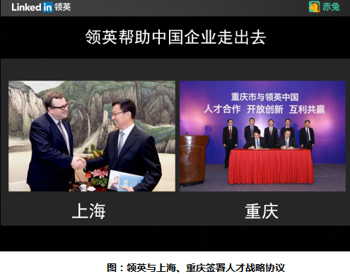除了政府层面的合作,领英的招聘解决方案获得了越来越多中国企业的青睐,在更广范围内发挥着连接中国企业与世界的作用。领英在全世界范围内帮助中国企业招募优秀人才,树立雇主品牌,同时利用大数据帮助那些源自中国的跨国企业进行全球人才布局。在第八届中美互联网论坛上,领英和滴滴出行签署了全面合作协议,帮助其在北美地区招募优秀人才。