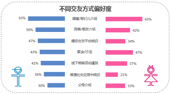 不仅对待恋情“父母说的不算”,在“介绍对象”这件事上,90后同样也不喜欢父母过多的干涉,其中,男性最不喜欢父母为自己介绍相亲对象,“闺蜜、哥们儿介绍” 是90后最偏好的婚恋交友方式,男女均占63%的比例,其次便是同事朋友介绍,近五成男女接受这种方式。同时,通过婚恋交友平台寻找也是男性偏好的方式之一,近47%的男性会通过这种方式去寻找另一半,婚恋交友平台在男性偏好的交友方式中排入Top3。而“父母介绍”则是所有交友方式中占比最少的一个选项,仅有30%的男性和33%的女性能介绍父母帮忙介绍对象。可见90后对待爱情的态度是“我的爱情我做主”。