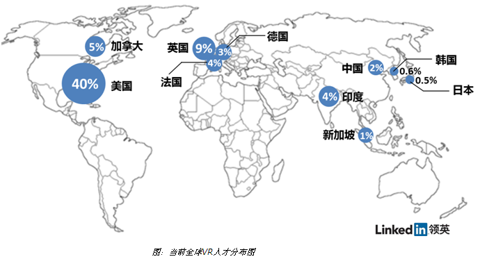 在领英平台的数据中,全球VR人才市场展现出了以下特征:当前全球VR从业者主要分布在美国、英国、加拿大、德国、印度等以IT高科技为主导的创新型国家和地区。